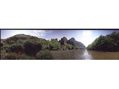 Panoramic view obtained through a digital stitching process between the original 360 degrees pictures riverside landscape near Arta, Greece.