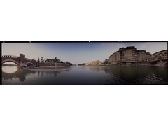 Panoramic view obtained through a digital stitching process between the original 360 degrees pictures of Ponte Scaligero in Verona, Italy and Ponte Vecchio in Florence, Italy.