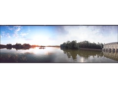 Panoramic view obtained through a digital stitching process between the original 360 degrees pictures of Pont Canal in Briare, France and Chateau de Chenonceau in Chenonceau, France