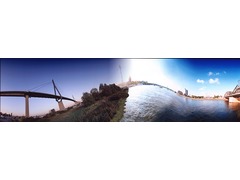 Panoramic view obtained through a digital stitching process between the original 360 degrees pictures of Kohlbrandbrucke in Hamburg, Germany and Hohenzollernbrucke in Keulen, Germany.