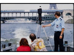 Paul Gofferjé and Trudy Nijman sitting at the stern (rear) of a boat while a policeman assigned with their protection is holding the tripod of the camera, taking a 360 degrees picture of the Pont de Bir-Hakeim in Paris.