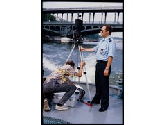 Paul Gofferjé preparing the photographic equipment while sailing near Pont de Bir-Hakeim bridge in Paris. Located at the stern (rear) of the boat, a policeman assigned with their protection, is holding the tripod of the camera, so it does not fall in the river because of the waves.