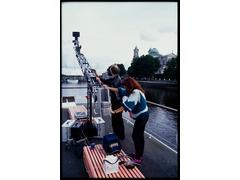 Paul Gofferjé and Trudy Nijman handling the crane of the 360 degrees camera on a floating pontoon.