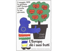 Europe Day of the Council of Europe (CoE) Poster: a man’s silhouette, filled with the European flag's colours and symbol, holds a vase with a tree. The vase bears the dates 1949-1979, marking 30 years of the CoE. The tree's fruits display achievements such as the migrant workers' rights statute, the social charter, and the definition of human rights.