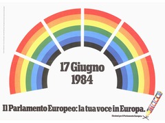 Poster published in Italy for the European Parliament elections held on 17 June 1984: a coloured design representing the European Parliament Hemicycle encloses the date of the 17/06/1984. The caption: ‘The European Parliament: your voice in Europe’ and the pencil (reminding the 1979 EP election poster) invites European citizens to go to the polls to vote.