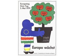 A man’s silhouette, filled with the European flag's colours and symbol, holds a vase with a tree. The vase bears the dates 1949-1979, marking 30 years of the Council of Europe (CoE). The tree's fruits display achievements such as the migrant workers' rights statute, the social charter, and the definition of human rights.