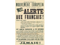 The poster warns French people about Soviet Union's "divide and conquer" strategy and its attempts to destabilize the free world. It notes that while Russia initially rejected, it later accepted a Four-Power Conference on November 27. The text questions whether this is a genuine effort to end the Cold War or a tactic to isolate France from its allies, as Bidault fears. It urges the French to reject any attempt to undermine the ratification of the European Defense Community (EDC) Treaty, which could jeopardize alliances, and to respond with a firm "Never."