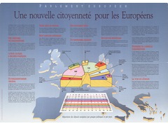 Infographic "A new citizenship for Europeans". Content of the text: roles, powers, structure, working locations and official languages of the European Parliament. In the centre: distribution of parliamentary groups.