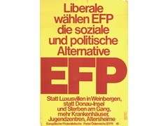 Slogans: "Liberals choose EFP – the social and political alternative. Instead of luxury villas in vineyards, instead of Donauinsel and dying in the hallway: more hospitals, youth centers, nursing homes!”.