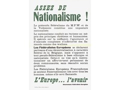 Message from Francophone European Federalists: condemnation of M.P.W. and Volksunie federalism as a nationalist façade promoting division and racism, contrary to Christian and humanist values; support for federal decentralization of Belgium; rejection of ethnic-based federalism: it institutionalizes conflict between Flemish and Walloon communities without solving real issues; call for unity and solidarity with all people, including the Flemish.