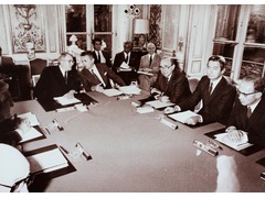 François Luchaire having an exchange with French Prime Minister, Pierre Mauroy, during a Cabinet meeting