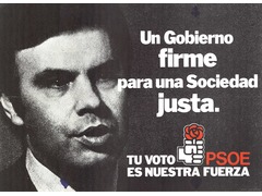 Poster from the Spanish election advocating for votes for the Partido Socialista Obrero Español with the quotes "A strong government for a just society" and "Your vote is our strength".