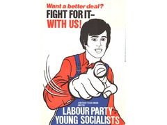 Poster advocating for better deals encouraging the reader to join their trade union and the labour party young socialists, the image features a worker pointing directly at the viewer.