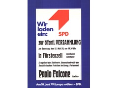 Poster announcing a Sozialdemokratische Partei Deutschlands (SPD) public meeting with the secretary General of the European Socialist Group parliament, Paolo Falcone.