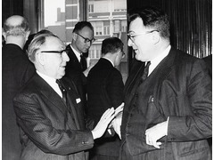 Albert Coppé, Member of the CEC in charge of Budgets, Levies, Credit and Investment and the Information Service, on the right, speaking with Joseph van der Meulen, Belgian Permanent Reprensentative to the EC in the 24th meeting of the Council of the Ministers for Foreign Affairs from the EC Member States.