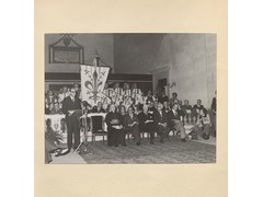 The Mayor of Fiesole Adriano Latini giving his speech in the Inauguration of the European University Institute at the Badia Fiesolana. From the left; the Titular Archbishop of Tusuro, Deputy of the Secretary of State, Monsignor Giovanni Benelli, the Minister of Public Education Franco Maria Malfatti, Ambassador Rosentand Hansen, first President of the Superior Council of the Institute Mr. Elio Gabbuggiani, Mayor of Florence.