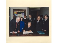 The former Mayor of Florence, Antonio Lattarulo, signs the visitors' book during the commemorative celebration of the 20th anniversary of the European University Institute, accompanied by the President of the Institute, Patrick Masterson.
