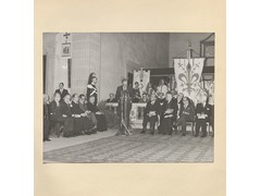 President of the Council of the European Communities J. A. Van Kermenade during his speech in the Inauguration of the European University Institute at the Badia Fiesolana. From the left: the Mayor of Fiesole Adriano Latini, the Titular Archbishop of Tusuro, Deputy of the Secretary of State, Monsignor Giovanni Benelli, the Minister of Public Education Franco Maria Malfatti, President of the European University Institute, Max Kohnstamm.