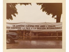 Banner in Badia Fiesolana announcing "UN GOVERNO EUROPEO PER UNIRE L'EUROPA PER CONSTRUIRE LA PACE E LA GIUSTIZIA INTERNAZIIONALE" (A European government to unite Europe to build peace and international justice).