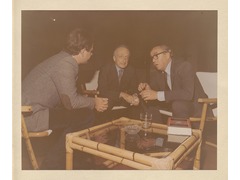 British President of the European Commission, Roy Jenkins, and two other people talking.