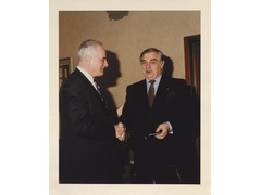 The director-General of the General Agreement on Tariffs and Trade and speaker of the 17th Jean Monnet Conference, Peter Sutherland and the President of the European University Institute, Patrick Masterson, shaking hands in Badia Fiesolana.