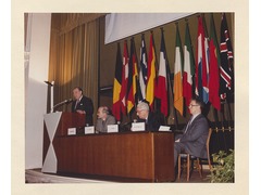 The former Prime Minister of the French Republic, Raymond Barre, during his speech, accompanied by the President of the European University Institute, Emile Noël, and, the possibly professors from the European University Institute, S. Martin and R. Morgan at a conference.
