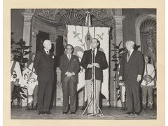 The Mayor of Florence Elio Gabbuggiani, during his speech in the Inauguration of the European University Institute. Next to him from the left: Max Kohnstamm, first president of the European University Institute, the Minister of Public Education Franco Maria Malfatti, and the Ambassador Rosentand Hansen, first President of the Superior Council of the European University Institute.