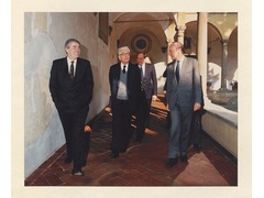 The Prime Minister of the Netherlands, Ruud Lubbers, the Ambassador of the Netherlands in Italy, P. H. Houben, and the President of the European University Institute, Emile Noël, in the cloister of Badia Fiesolana.
