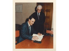 The Prime Minister of Portugal, Anibal Cavaco Silva signing the visitors book, with the President of the European University Institute, Emile Noël.