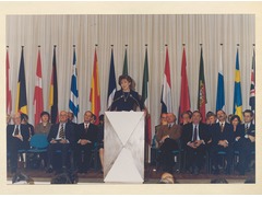 Portrait of the President of Ireland, Mary McAleese, during her speech in the XXI Jean Monnet Conference. In the back, the President of the European University Institute, Patrick Masterson, the Secretary General of the of the European University Institute, Antonio Zanardi Landi and others.
