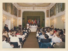 General view from the back of the audience of the conference for the visit of the President of Portugal, Jorge Sampaio. The President of the European University Institute, Patrick Masterson, during his speech, and in the table the President of Portugal, Jorge Sampaio, the Ambassador of Portugal, João Diogo Nunes Barata and the Secretary General of the of the European University Institute, Antonio Zanardi Landi.