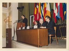 The President of Portugal, Jorge Sampaio during his speech. Next to him, in the table, the Ambassador of Portugal, João Diogo Nunes Barata, the President of the European University Institute, Patrick Masterson and the Secretary General of the of the European University Institute, Antonio Zanardi Landi.