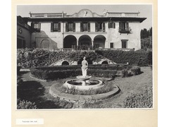 The back of the fountain statue, part of the garden, and the south façade of Villa Schifanoia.