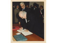 The Italian Senate and professor, Giovanni Spadolini, signing the visitors' book of the European University Institute next to the President of the European University Institute, Emile Noël.