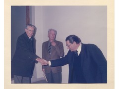 The President of the European University Institute, Werner Maihofer, greeting someone in the inauguration of academic year 1985-1986, between them, the Secretary General of the European University Institute, Marcello Buzzonetti.