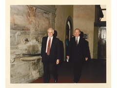 The President of the European University Institute, Patrick Masterson, with the President of the European Comission, Jacques Santer, in front of the fountain in Badia Fiesolana.