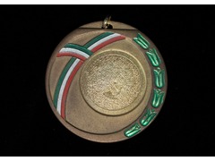 Médaille commémorative en bronze à double face. L'avers présente un champ circulaire central en creux, à la surface texturée. À gauche, trois bandes courbes en relief, émaillées en vert, blanc et rouge, forment un motif tricolore stylisé. Le long du bord droit, une séquence verticale d'éléments décoratifs répétés en émail vert est appliquée en relief. La surface présente une combinaison de textures lisses et granuleuses.