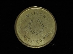 Médaille commémorative en bronze à double face. Le revers présente un motif circulaire de douze étoiles à cinq branches gravées au centre. L'inscription « Maison d'Europe » est gravée sur le bord supérieur.
