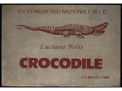 Plaque rectangulaire ornée d'un crocodile stylisé en relief, rehaussé d'émail rouge, disposé horizontalement au centre de la partie supérieure. Au-dessus du crocodile, une inscription gravée indique : XIV Congresso Nazionale M.F.E. (Movimento Federalista Europeo). Sous le crocodile figure le nom de Luciano Bolis en écriture cursive. La partie inférieure de la plaque est dominée par le mot CROCODILE en grandes lettres capitales en relief, émaillées en rouge. Dans l'angle inférieur droit, la date gravée 2–5 Marzo 1989 est présente. Le fond est mat et légèrement texturé, encadré d'une fine bordure en relief.