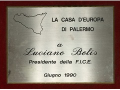 Plaque rectangulaire en métal brossé, encadrée d'un fin cadre métallique. Dans le coin supérieur gauche, une carte de la Sicile est gravée. À droite et en dessous, une inscription gravée indique : « La Casa d’Europa di Palermo a Luciano Bolis presidente della F.I.C.E. giugno 1990 ». La plaque est fixée sur un support en textile ou en feutre rouge, visible sur les bords extérieurs.