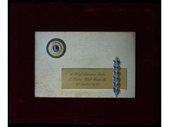 Plaque rectangulaire en métal montée sur un support textile bordeaux. En haut à gauche, un emblème circulaire en relief porte l'insigne du Lions Club, sur fond émaillé bleu et orné de détails dorés. Au centre, une plaque rectangulaire en métal porte une inscription gravée en écriture cursive :