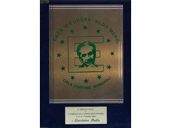 Plaque rectangulaire en métal fixée sur un support textile bleu foncé. La plaque principale présente une surface en métal brossé ornée d'un décor émaillé vert. Sur le bord supérieur, une inscription en arc de cercle indique « Casa d’Europa - Aldo Moro », tandis que le bord inférieur porte l'inscription : « Cala Corvino Monopoli ». Une plus petite plaque rectangulaire en métal, appliquée sous la plaque principale, porte l'inscription gravée : « Il Mercato Unico e l’Economia dell’Europa Mediterranea 4–5–6–7 Maggio 1989 a Luciano Bolis ».