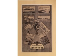 La composition rassemble plusieurs vues emblématiques de l’île de Ventotene et de ses environs. Les photographies sont disposées de manière dynamique, légèrement inclinées, évoquant un collage souvenir. Au centre, un motif floral dessiné agit comme élément unificateur et décoratif. La légende inférieure, intégrée dans un cartouche ornemental, porte l’inscription : « Un pensiero da Ventotene », formule typique des cartes-souvenirs.