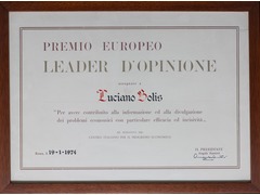 Diplôme de nomination intitulé "Premio Europeo – Leader d’Opinione", décerné à Luciano Bolis. Le document reconnaît sa contribution à l’information et à la diffusion des problématiques économiques, soulignant l’efficacité et la portée incisive de son action. Le prix est attribué à l’initiative du "Centro Italiano per il Progresso Economico". Le certificat est daté Rome, 19 janvier 1974, et porte la signature du président Angelo Santori. La composition graphique met en valeur le nom du récipiendaire en caractères calligraphiques rouges, au centre du document.