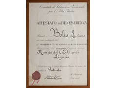 Le document reconnaît l’engagement actif et honorifique de l’intéressé en tant que membre du CLN pour la Ligurie, rôle exercé dans le cadre de la lutte de Résistance. Le texte, rédigé dans un style solennel et officiel, confère au titulaire la qualification de "Patriota", titre honorifique attribué aux acteurs reconnus de la lutte de libération nationale. L’attestation est validée par les signatures manuscrites du Secrétaire général et du Président, et authentifiée par un sceau en cire appliqué dans la partie inférieure du document.