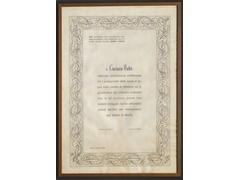 Document imprimé sur papier présenté dans un cadre en bois, enrichi d’un large encadrement décoratif à motifs végétaux de style classique. Diplôme commémoratif et civique rendant hommage à Luciano Bolis, reconnu comme valeureux combattant antifasciste et figure majeure de la longue lutte contre la dictature fasciste. Le document exprime la gratitude des citoyens milanais envers ceux qui, avec courage et sacrifice, ont contribué à la reconquête de la liberté en Italie. L’hommage s’inscrit dans le cadre du cinquantième anniversaire de la promulgation des lois d’exception fascistes et de la création du Tribunal spécial fasciste (1926–1976), soulignant la dimension mémorielle, civique et démocratique de la reconnaissance.