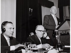 Sicco Mansholt, European Commissioner for Agriculture, speaks next to Walter Hallstein, President of the fist Commission of the European Economic Community (ECC) and Mario Ferrari Aggradi, Italian Minister of Agricultural, Food and Forestry Policies at the Stresa Conference. Commission officials, national ministers and civil servants, outside experts and representatives of farming organisations among the Six participated in the conference to discuss the introduction of the new Common Agricultural Policy (CAP).