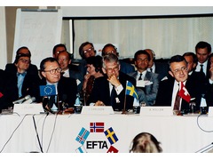 EFTA Heads of Government Ministers with Jacques Delors, President and Frans Andriessen, Vice-President of the European Commission, European Community (EC)