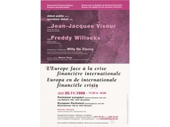 Poster on the public debate "L'Europe face à la crise financiere internationale" between Jean-Jacques Viseur, Freddy Willockx, Willy De Clercq and Michel Theys at the European Parliament in Brussels, Belgium, on 25 November 1998.