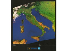 Poster with and image of Italy processed in false-colours but taken from earth observation satellites.